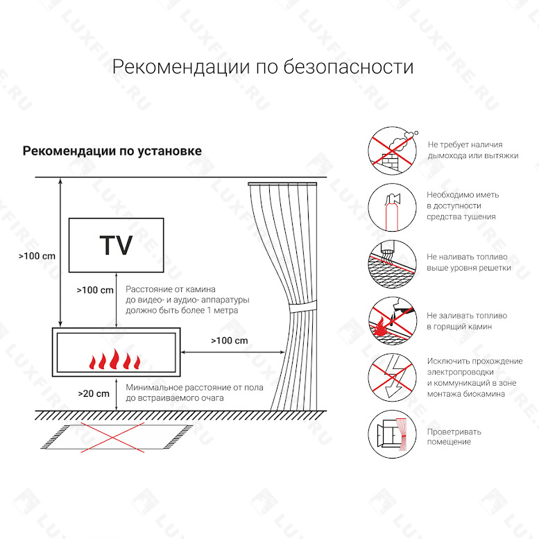 Очаг – это емкость куда заливается жидкое топливо. Емкость внутри заполняется керамическим материалом, который впитывает биотопливо, и в случае опрокидывания камина топливо не разливается. За счет этого конструкция стала полностью пожаробезопасной. Очаг встраивается в корпус из стали, который окрашивается специальной термостойкой краской, или же в заранее подготовленную нишу, изготовленную из негорючих материалов.
