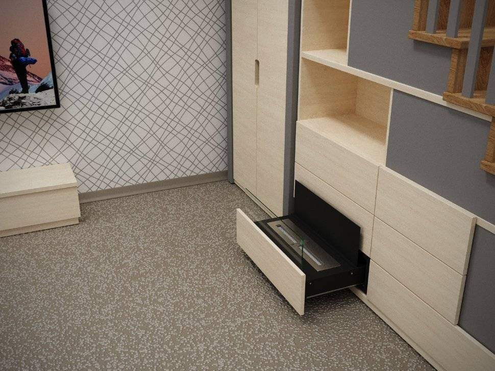 Представляет собой сборную выдвижную металлическую конструкцию (внешний корпус + механизм трансформации и выдвижной элемент с топливным блоком ), способную создать полуоткрытое безопасное пространство для огня ограниченную складывающимся защитным экраном (закаленным стеклом) и металлическим отражателем.Предназначен для встраивания в межкомнатные перегородки из ГКЛ, мебель из МДФ, ЛДСП, конструкций из кирпича, пеноблоков, бетона.