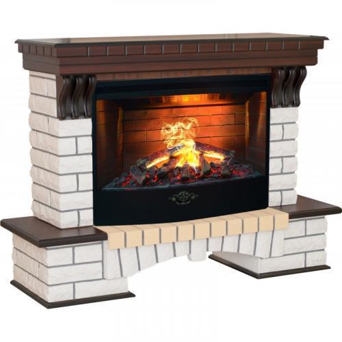 Такой каминокомплект точно станет настоящим украшением классического интерьера. Декорирование помещения и является его основной функцией. Немалую роль в этом играет реализованная технология имитации реалистичного пламени. Формируется оно за счет работы парогенератора, формирующего паровую завесу, и системы галогеновых ламп со светофильтрами, обеспечивающих подсветку. Семь ламп обеспечивают высокую интенсивность подсветки, поэтому пламя будет видно даже в хорошо освещенном помещении. Высота пламени легко регулируется за счет изменения интенсивности парогенерации.